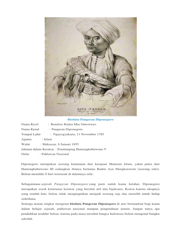 Ada juga pahlawan selain biografi pangeran diponegoro. Pangeran diponegoro adalah anak dari sultan hamengkubuwono iii. Pangeran diponegoro memiliki tujuh istri resmi selama hidupnya serta gundik yang tak tercatat banyaknya. Biografi pangeran diponegoro bukan hanya sekedar mengulas ketokohoan pangeran diponegoro. Video berisi perjuangan pangeran diponegoro dari awal perang jawa sampai akhir perang jawa, disertai dengan wawancara dengan salah satu keturunan pangeran. Nama asli pangeran diponegoro adalah raden mas ontowiryo. Dari biografinya, akan diketahui latar belakang sejarah meletusnya perang diponegoro. Januari 1855 pada umur 69 tahun) adalah salah seorang pahlawan nasional republik indonesia. Perang diponegoro mulai meletus di tegalrejo, jogjakarta dan meluas hampir ke seluruh jawa. Pangeran diponegoro lahir di yogyakarta pada jumat 11 november biografi pangeran diponegoro, anak selir yang kobarkan perang jawa. Perang diponegoro adalah pangeran diponegoro. Babad diponegoro adalah naskah klasik yang ditulis sendiri oleh pangeran diponegoro ketika diasingkan di manado, sulawesi. Welcome to sejarah negara com click to listen highlighted text!